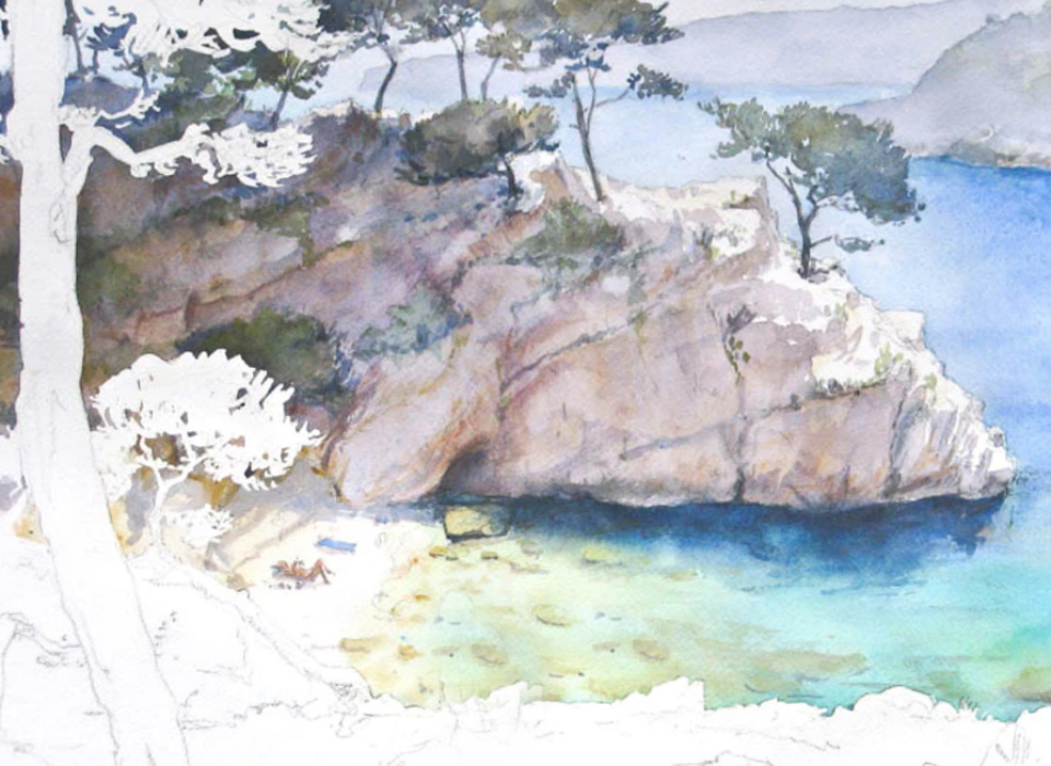Je vous propose un stage d’aquarelle et de croquis sur le vif, au cœur des calanques : roches lumineuses, eau turquoise, pins tordus par le vent… un terrain de jeu idéal pour apprivoiser la lumière méditerranéenne.